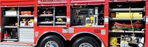 Compartimentos laterales repletos de herramientas y equipos esenciales para distintas emergencias, como mangueras de distintos diámetros, equipos de excarcelación, herramientas manuales y dispositivos eléctricos